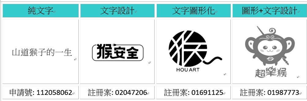 商標可以由文字、圖形、記號、顏色、立體形狀、動態、全像圖、聲音等,或其組合而成。顧名思義,文字、圖案商標由分別由文字或圖形組成。可以是純文字、文字設計、文字圖形化、圖形,也可以文字加圖形,由申請人自由決定,以下舉例說明。